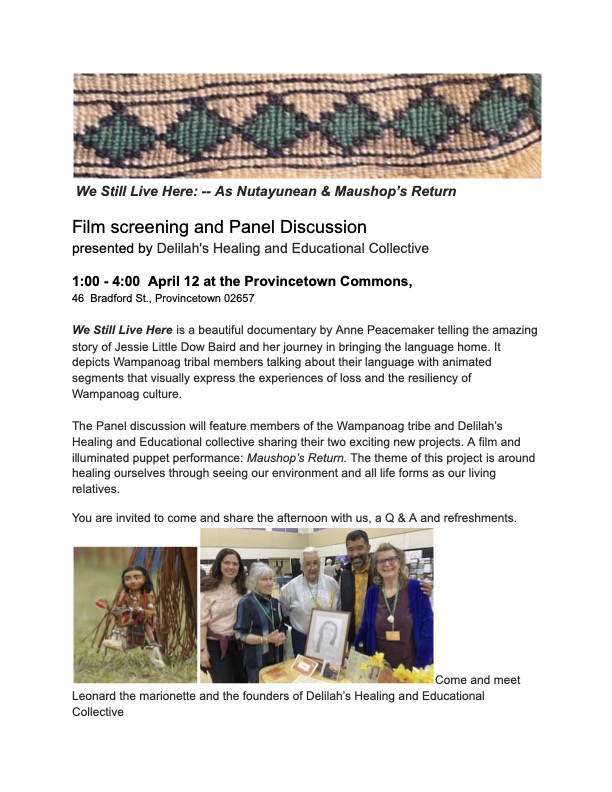 Delilah's Collective is hosting the film, WE STILL LIVE HERE (Âs Nutayuneân) ... tells a remarkable story of cultural revival by the Wampanoag of Southeastern Massachusetts. Their ancestors ensured the survival of the Pilgrims in New England, and lived to regret it....