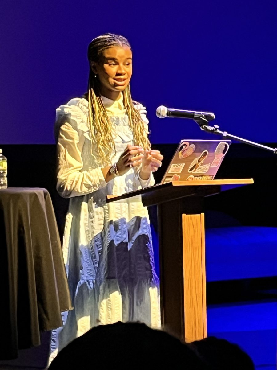 Activist and author Marley Dias speaks of her life experience and introduces the Keynote Speaker Ms. Rankine. At 10 years old, she founded #1000BlackGirlBooks that became a national movement to get books featuring protagonists of color into classrooms. Dias hosted a Netflix show that was called “Bookmarks: Celebrating Black Voices”. “Dias serves as the host and executive producer of the series, whose books and conversations center on themes of identity, respect, justice and action. She has also been the Ambassador for the National Education Association’s Read Across America program since 2021. And did I mention she’s a university junior?! (some of Marley Dias info above taken from Wikipedia).